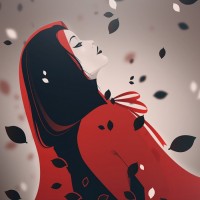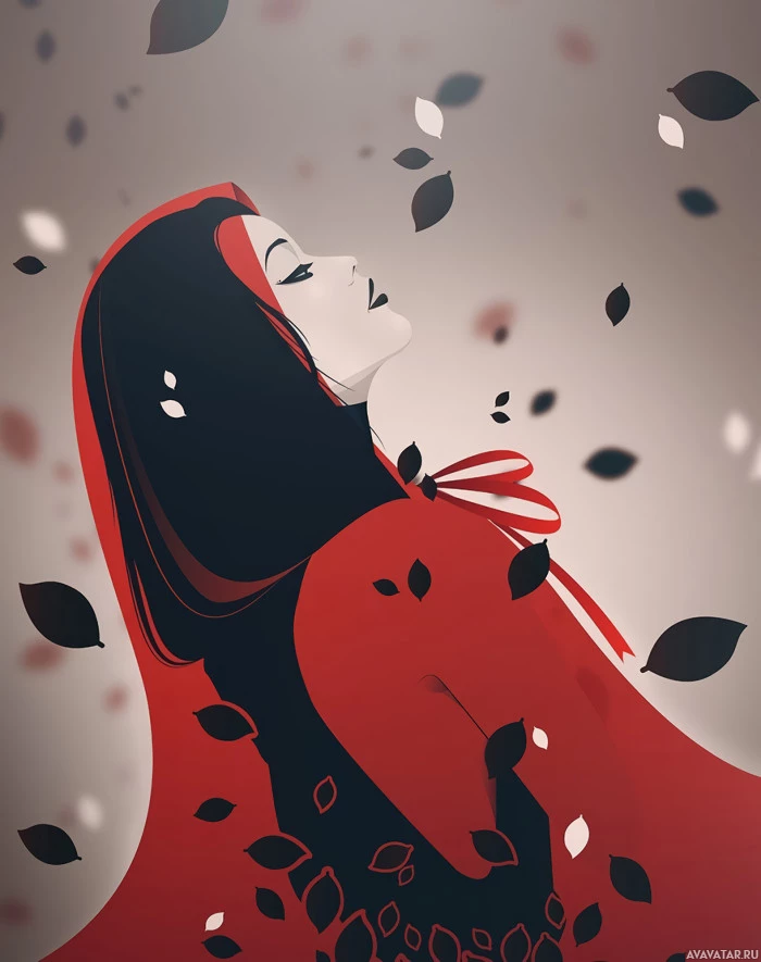 a brunette girl in a hooded cloak, which could be associated with certain folklore or fairy tale characters. She appears to be lying down amidst