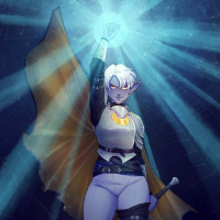 a dynamic pose with one hand raised as if casting a spell or holding a staff, while the other hand is holding a sword. The background has an ethereal quality with light effects that enhance