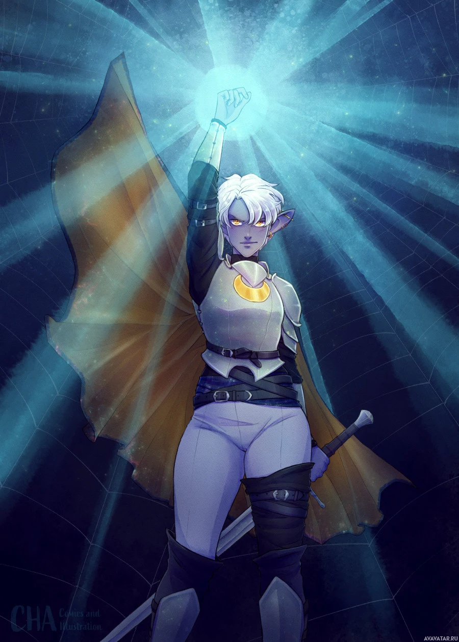 skinned elves known for their intelligence and mastery of magic. The character is shown in