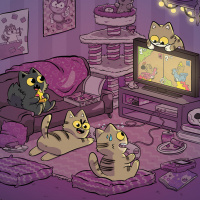 fur colors and patterns, suggesting a variety among them. The room is dimly lit by