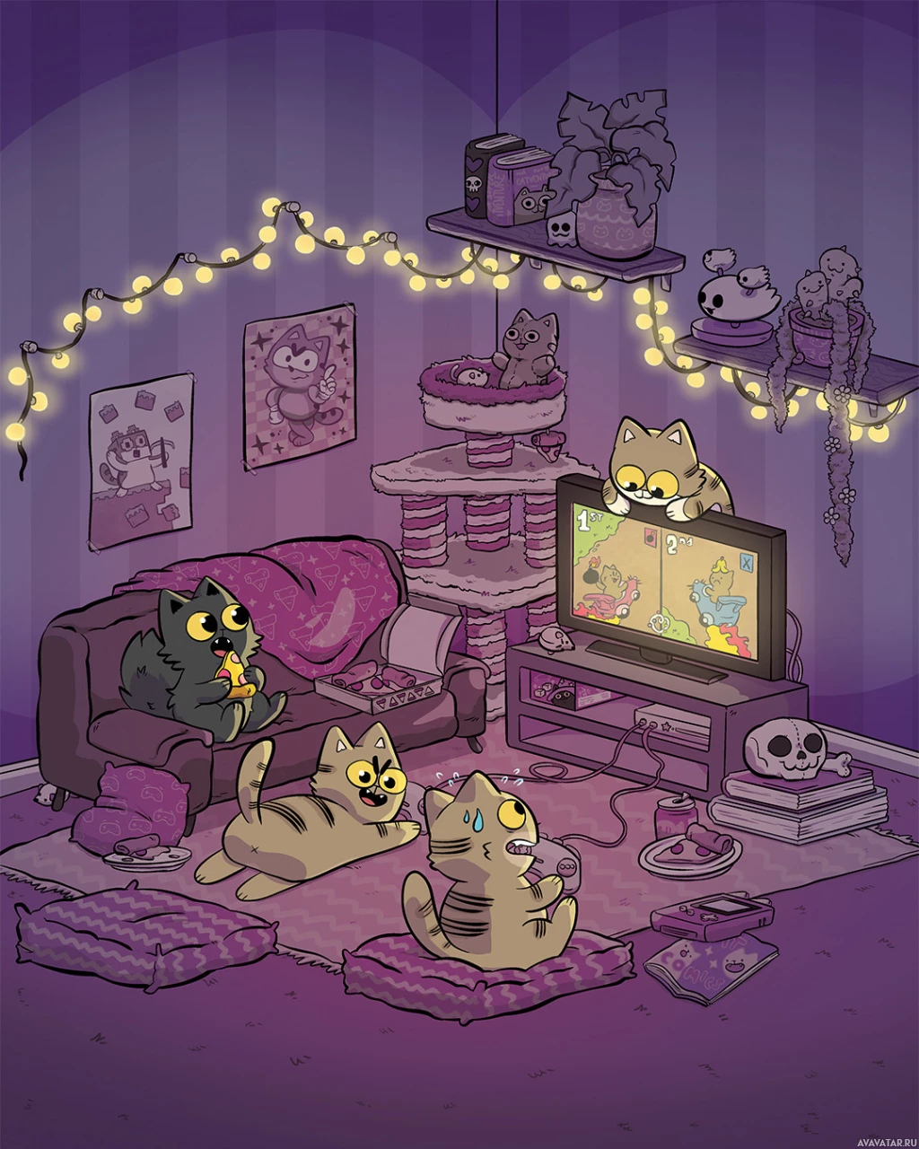 scene at night. There are three cats in the foreground, two of which appear to be watching TV with surprised or excited expressions on their faces, while