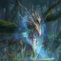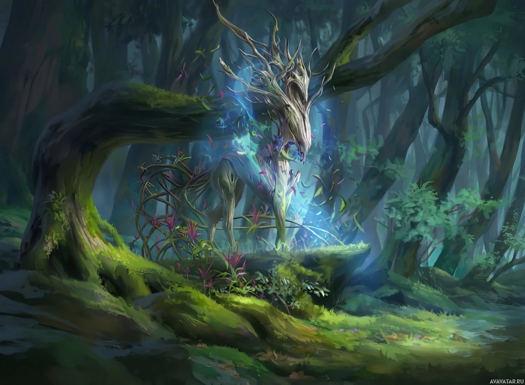 На картинке изображено фантастическое существо, похожее на единорога, в окружении волшебного леса. Кажется, что единорог стоит на поросшей мхом тропинке, окруженный деревьями и растениями, создающими чарующую атмосферу. Художественный стиль детализирован и реалистичен, с акцентом на фантастические элементы, такие как рог и общая неземная природа существа и его окружения.