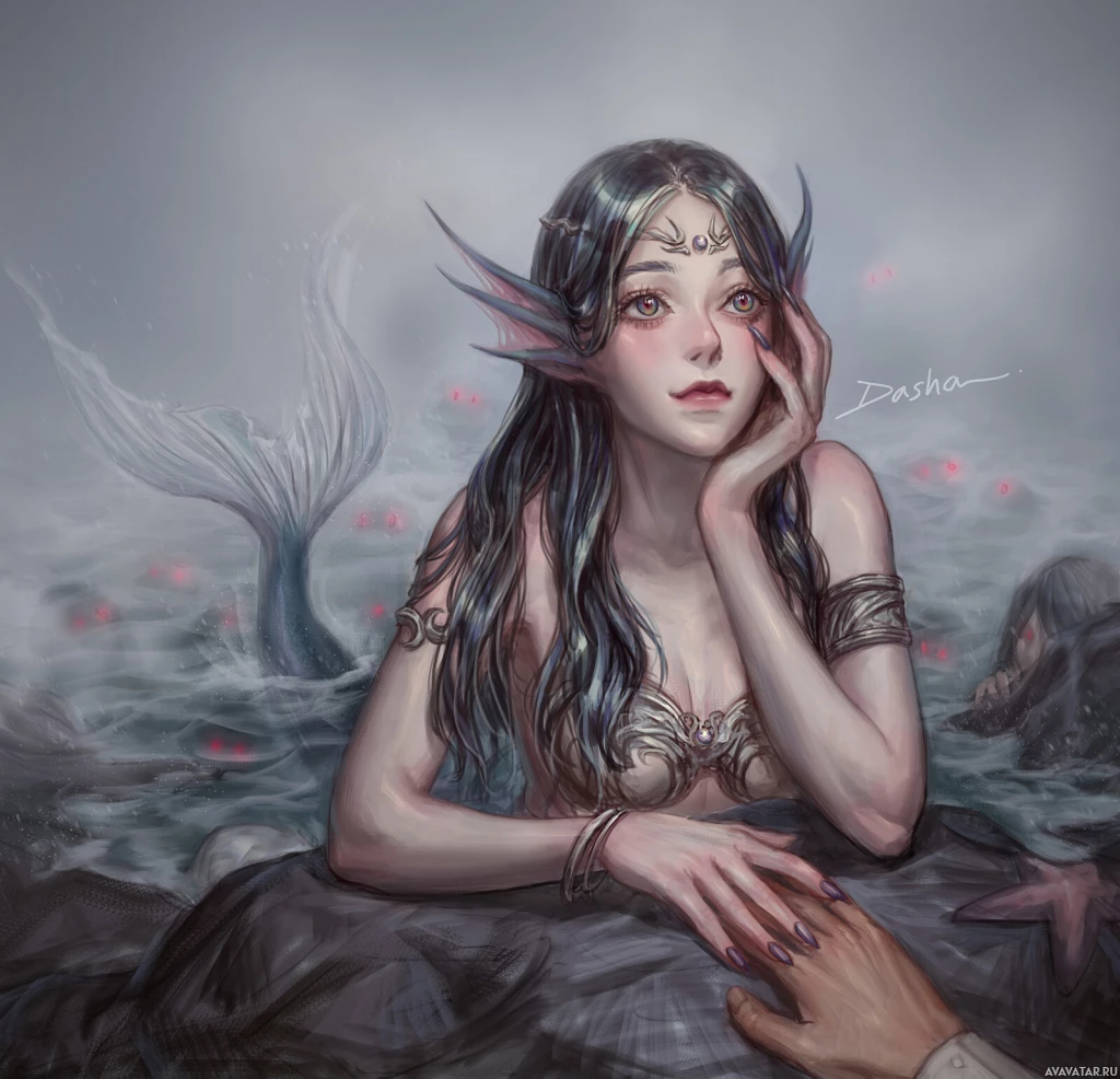 The image features a mermaid-like character with aquatic features such as fins, sitting on what appears to be