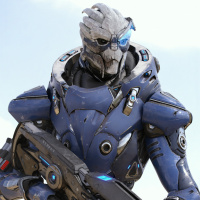 The image depicts a character from the video game "Mass Effect." This character is known as a Turian, which is an alien species in the Mass Effect universe. They are shown wearing armor and holding a weapon, indicating they might be part of a combat scenario within the game.