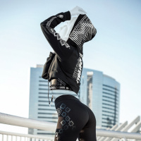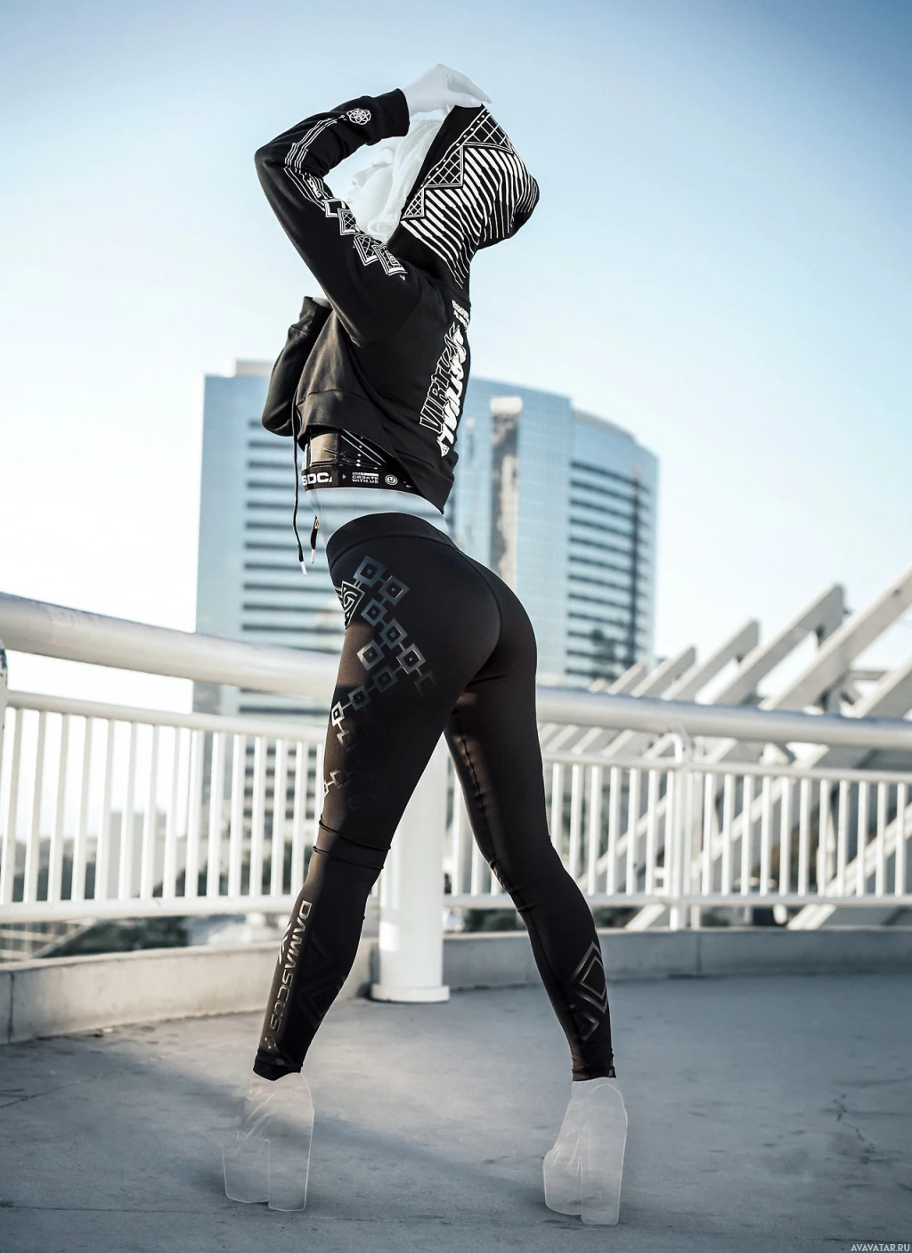 sort of design or pattern on it. They also have a hood covering their head, and the hood has additional designs or patterns on it that match the outfit they are wearing. There's a partial view of buildings in the background, suggesting