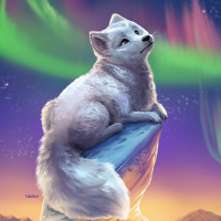 The image features an arctic fox. The fox is depicted in a stylized, cartoon-like artwork with a backdrop of a starry night sky and the Northern Lights. It's sitting on what appears to be an icy surface or a rock formation typical of arctic environments. The background also includes silhouettes of mountains under the aurora.
