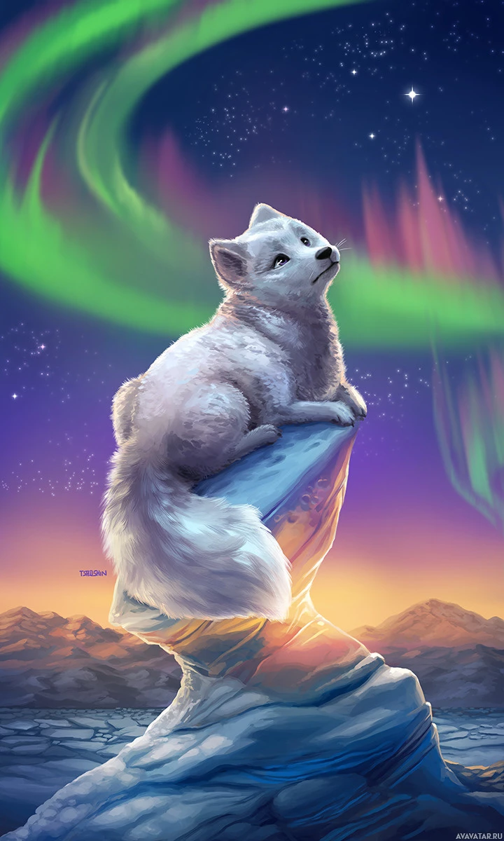 На картинке изображен песец. Лиса изображена в стилизованном мультяшном стиле на фоне звездного ночного неба и Северного сияния. Она сидит на чем-то, напоминающем ледяную поверхность или скальное образование, типичное для арктических условий. На заднем плане также видны силуэты гор в свете полярного сияния.