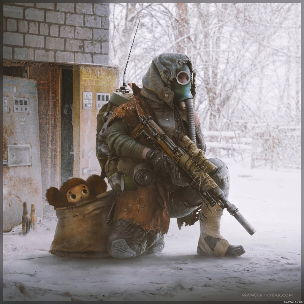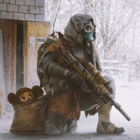 teddy bear can also be seen next to the person, possibly indicating a juxtaposition between innocence and hardship, or perhaps symbolizing protection of something soft in a harsh environment. The setting looks like a snowy