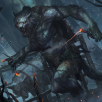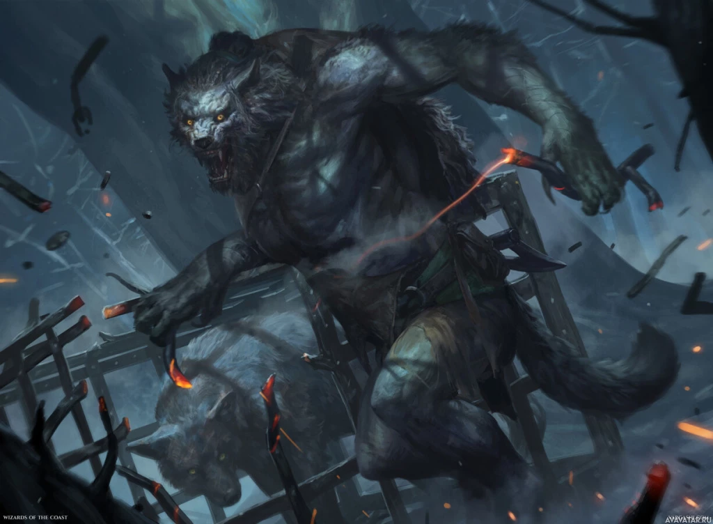 a fantasy scene featuring a werewolf character. The werewolf is in the center, standing amidst destruction, with debris scattered around and