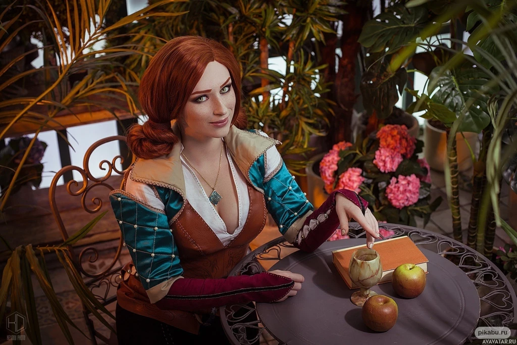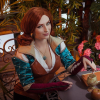 the video game "The Witcher 3: Wild Hunt" named Triss Merigold. She is portrayed in a cosplay setting, complete with props and attire that match her
