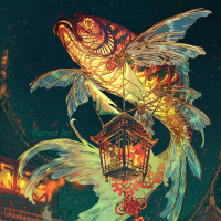 night scene with lit lanterns on buildings, which could indicate an oriental setting, possibly inspired by East Asian culture. The colors are vibrant and the overall atmosphere has a surreal or fantastical quality to it.
