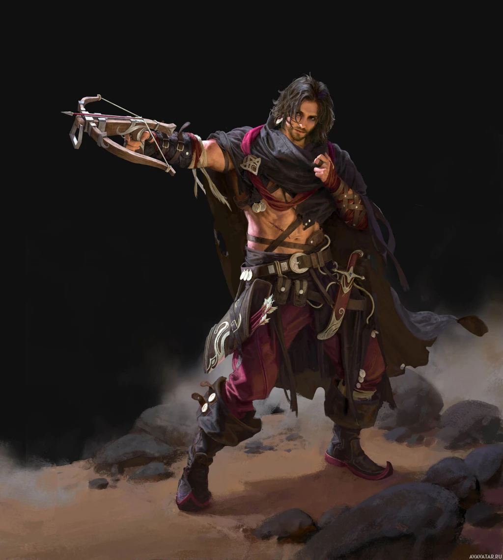the video game "God of War," who is known for his use of a crossbow and various combat techniques. He is standing on what appears to be a rocky surface with a dark,