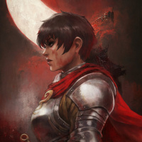 a night scene or battlefield setting. Her expression seems serious or intense.