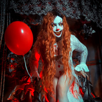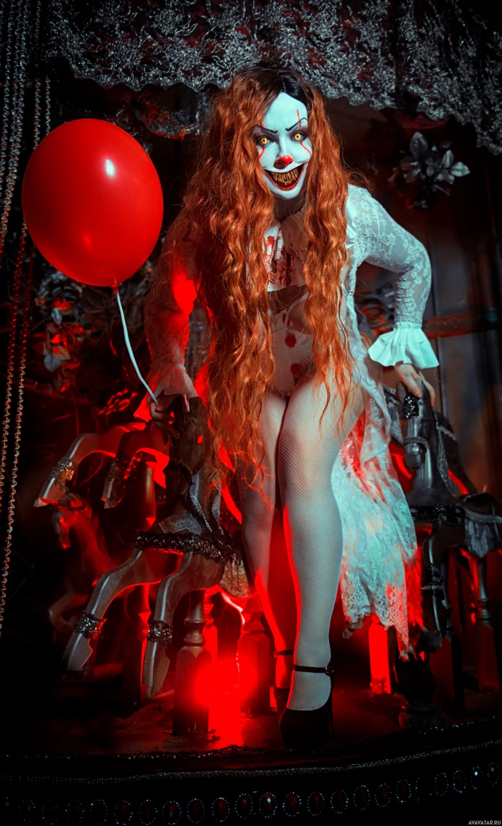 an eerie atmosphere, possibly resembling a circus tent or a setting from the movie "It". There's a clown nose on the face, a bright red balloon held in one hand, and