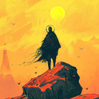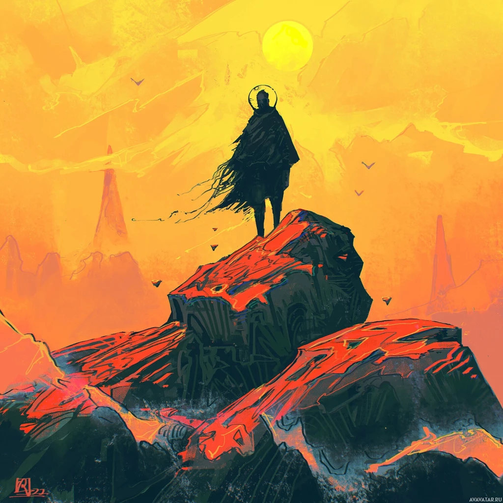 celestial body like the sun or moon. There are also birds flying in the air around the figure, adding to the serene and mystical atmosphere of the scene. The setting looks like it could be from a fantasy or science fiction context due to