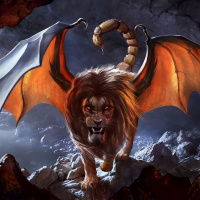 a fantastical creature that resembles a lion or a dragon. It has the body and head of a lion, with large, bat-like wings spread out from its back. The creature appears to be standing on rocks or ground within what looks like a dark cave or