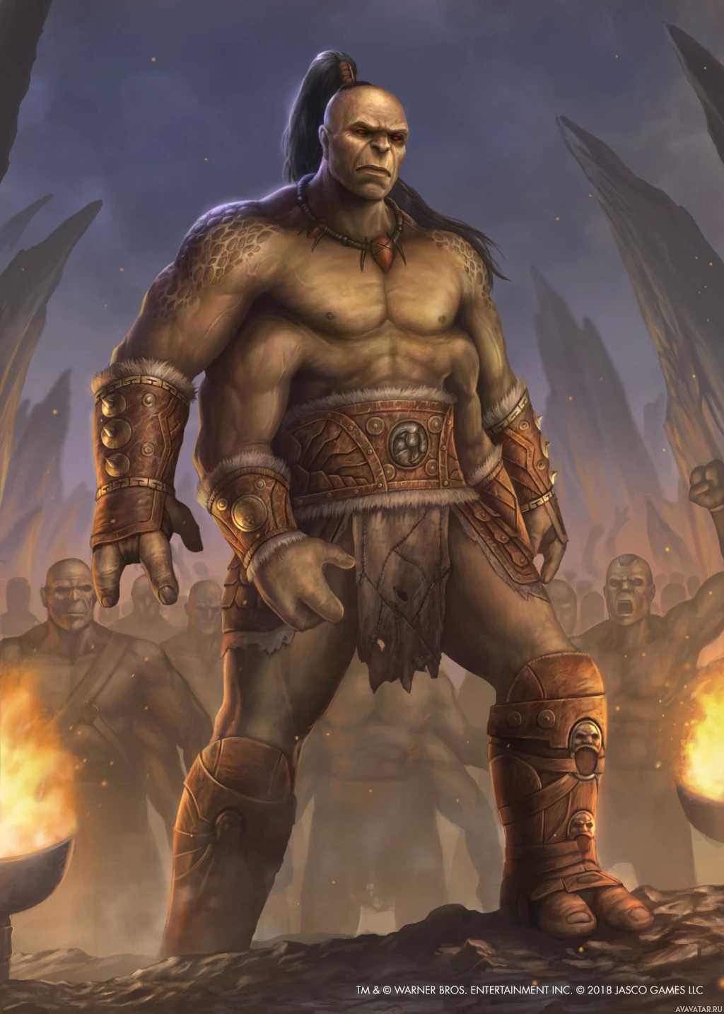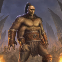 fighting stance, wearing traditional tribal attire and holding his iconic staff. In the background, there are other warriors or characters that appear to be part of the same tribe or faction as Goro. The setting suggests a battlefield scenario with an atmosphere of