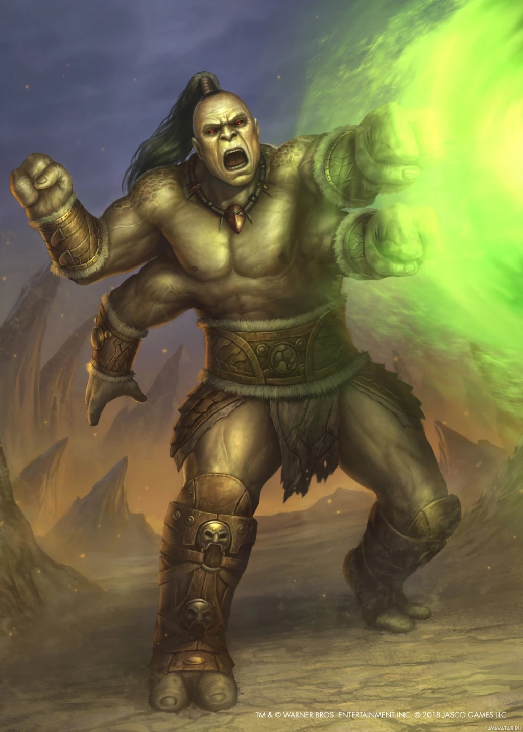 a muscular build, wearing tribal armor, and is shown performing a move that generates green energy. The setting appears to be an arena or battlefield, indicative of the Mortal
