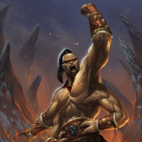gold accents and intricate detailing. The background gives the impression of a fiery or volcanic environment, enhancing the warlike theme associated with this character.