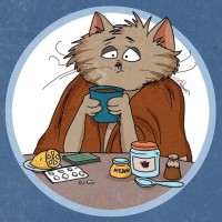 hot chocolate, which it might be enjoying or reacting negatively to. There are various objects scattered around the table: a bottle labeled "Ouch!," a pill bottle, and what appears to be a roll of paper or fabric with a red sticker on it, reading "HEY!" The background is a plain color with a circular border framing the image, suggesting that this might be an illustration or
