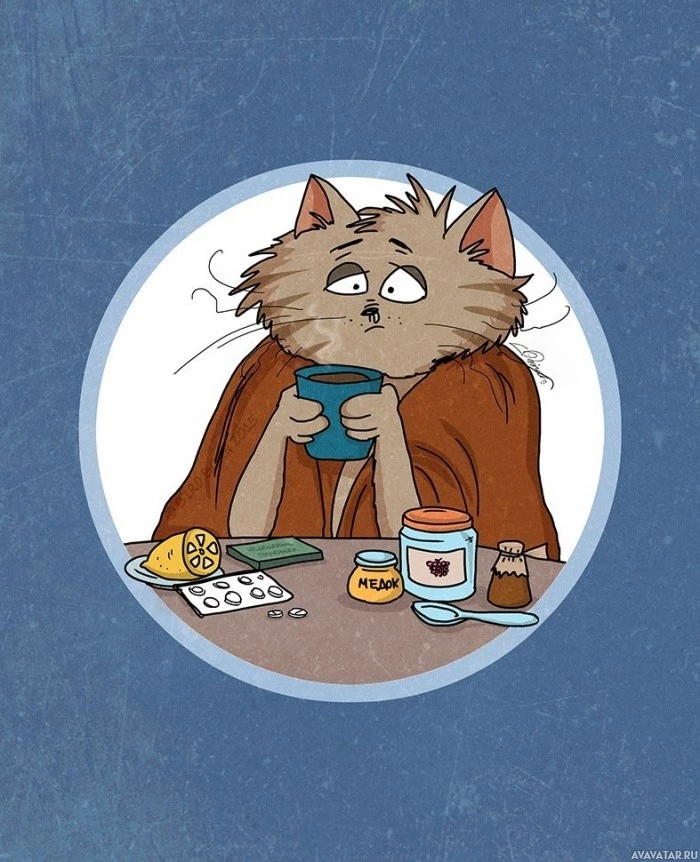 an animated cat sitting at a table. It appears to be in a state of distress or discomfort, as indicated by its