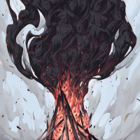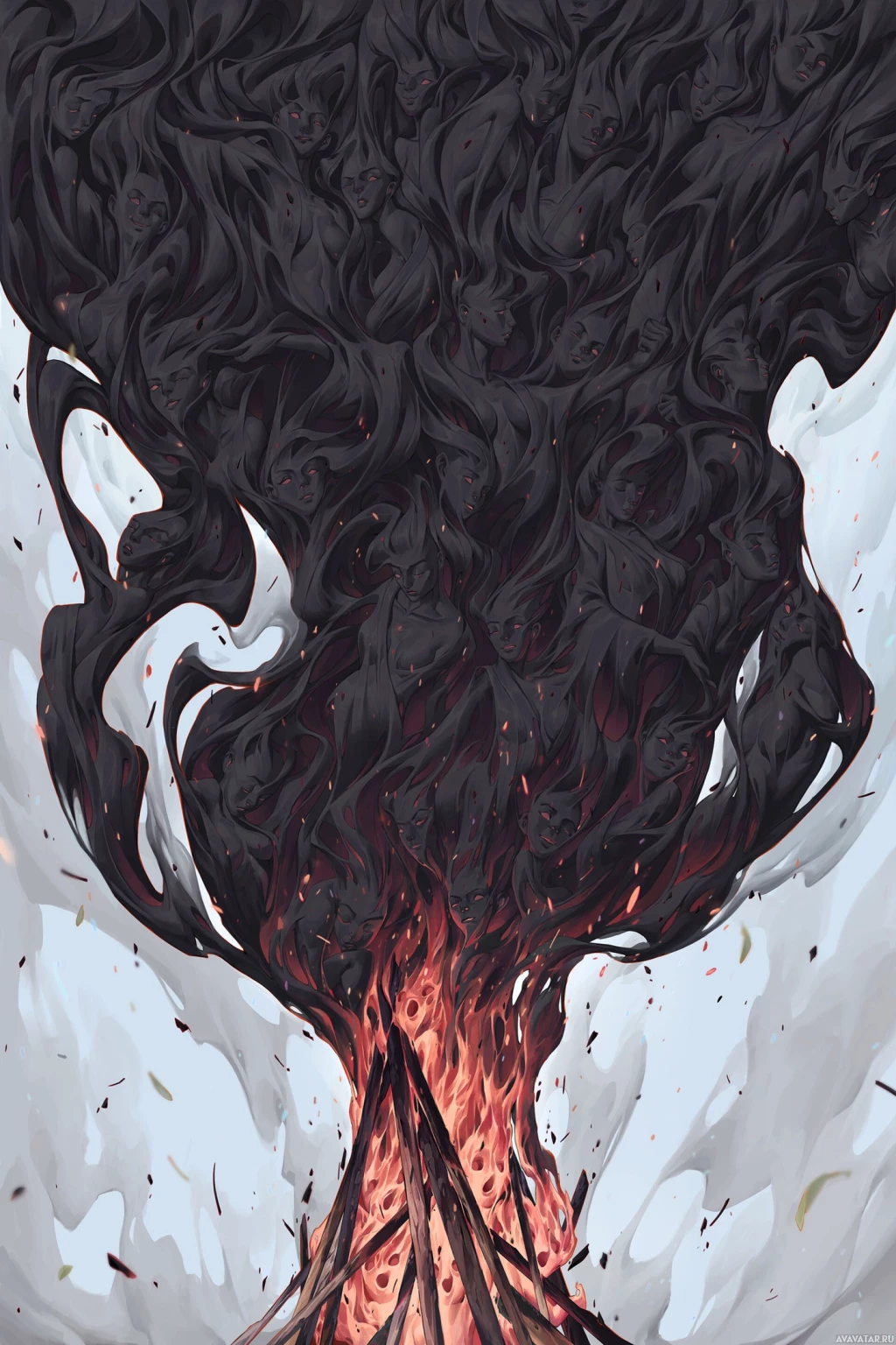 a raging fire, which appears to be the source of the smoke, as it billows outward. The figures are distorted and merged together in a way that suggests they are being overwhelmed or consumed by the flames and the smoke. It's a dramatic and powerful image likely intended to represent chaos or