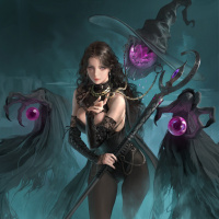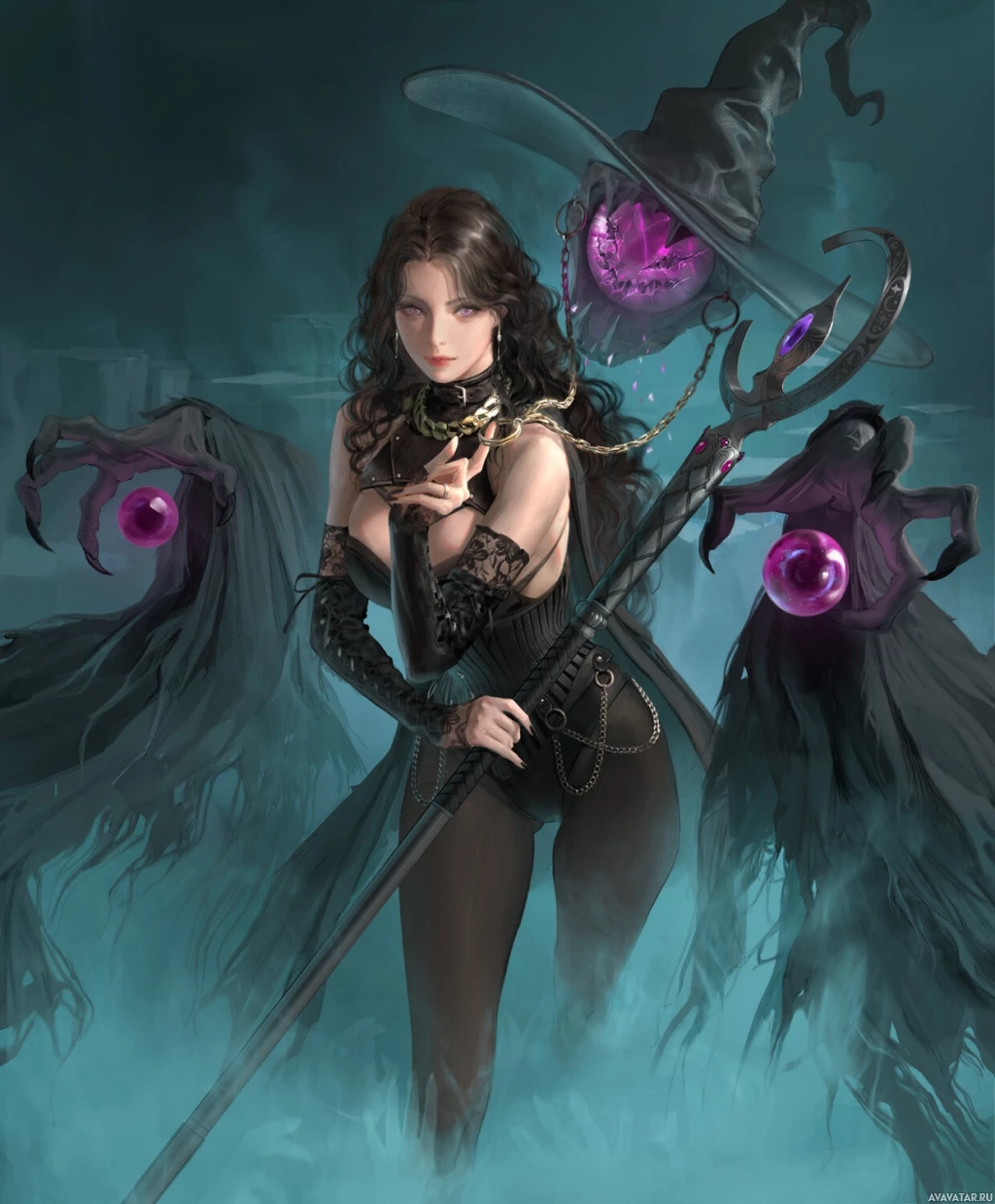 a fantasy scene with a woman who appears to be a witch or magical character. She has