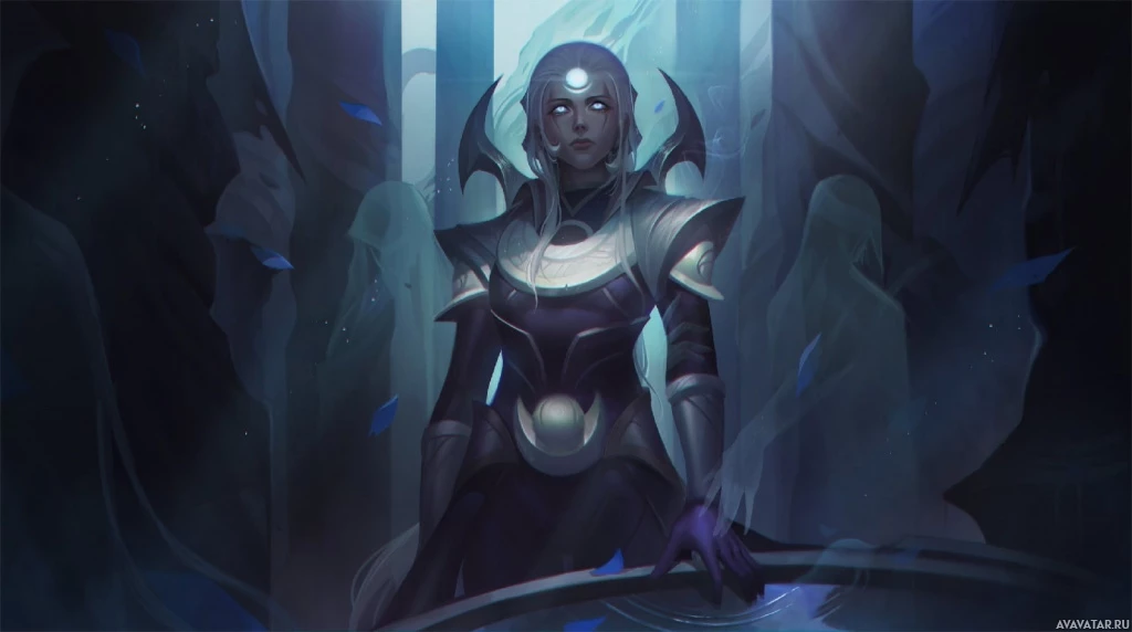 a female character with white hair, dressed in fantasy-style armor. She appears to be sitting on a throne or similar structure, and the background suggests an underground or dungeon setting with dim lighting and rock formations. The character has