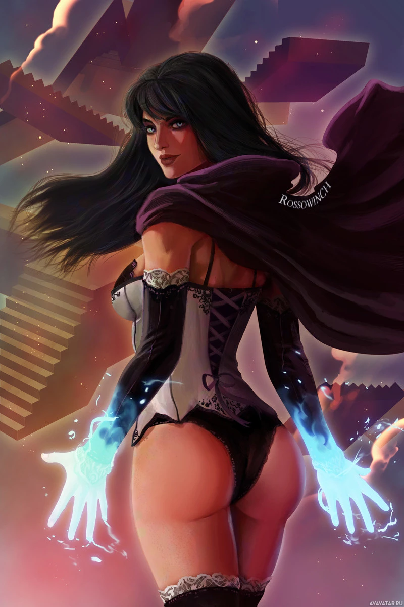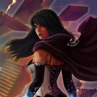 dark hair, wears a cloak, and is dressed in an outfit that appears to be inspired by steampunk or fantasy elements with corsets and a garter belt. Her pose suggests movement and she seems to be casting a spell or using some kind of