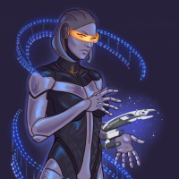 Effect series. The character is designed with robotic features such as mechanical limbs and parts, along with glowing