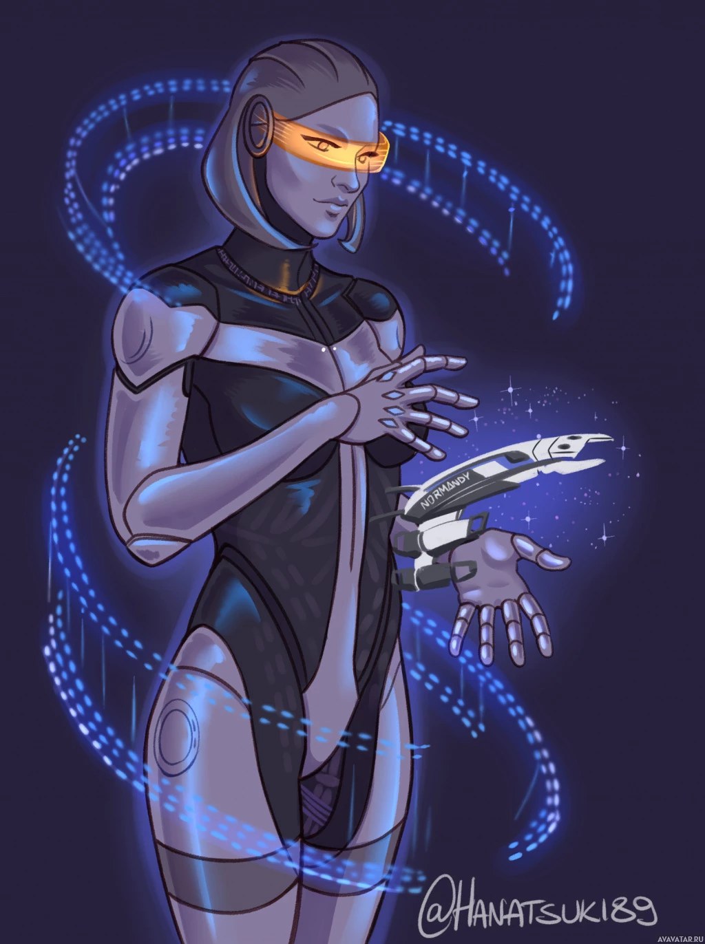 an animated character that appears to be a humanoid robot or android from the Mass Effect universe. This character is identified as EDI (Extended Diagnostics Initiative), one of the central characters in the Mass