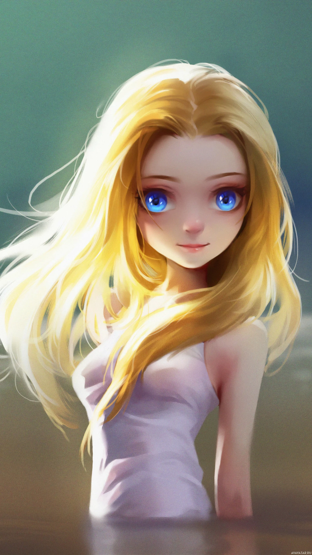 На картинке изображен анимационный или иллюстрированный персонаж, молодая женщина со светлыми волосами. У нее голубые глаза и она одета во что-то похожее на светлый топ. Она стоит у кромки воды, излучая безмятежную и созерцательную атмосферу.