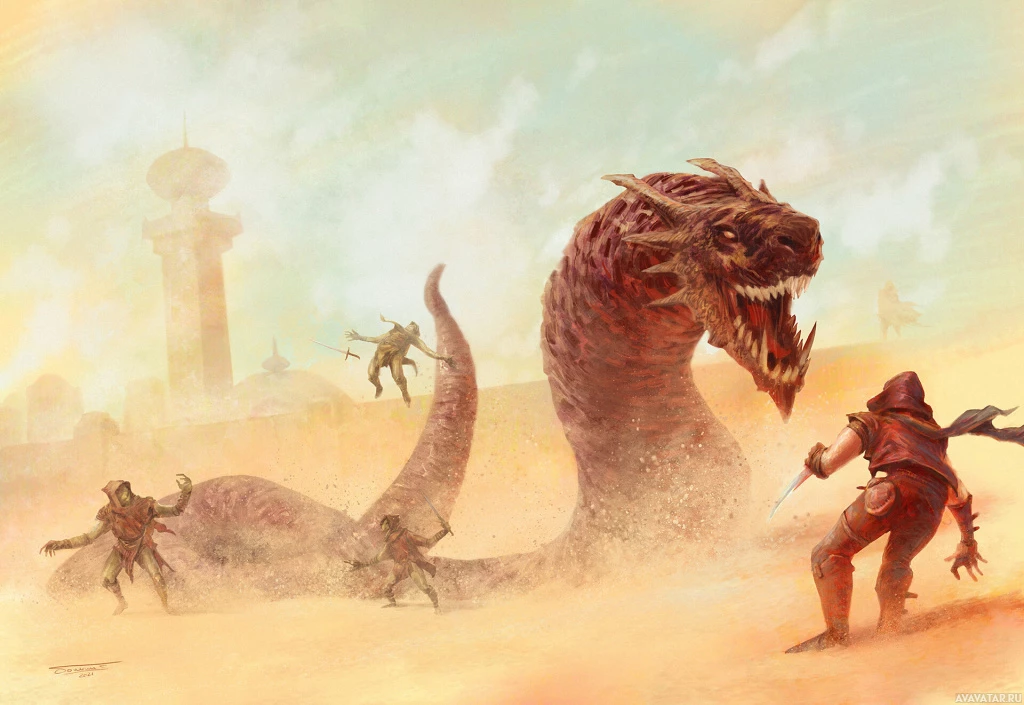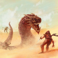 a large dragon-like monster with its mouth open as if growling or roaring. To the right of this creature, there are two figures engaged in combat: one appears to be an armed warrior and the other could be a mystic or someone using