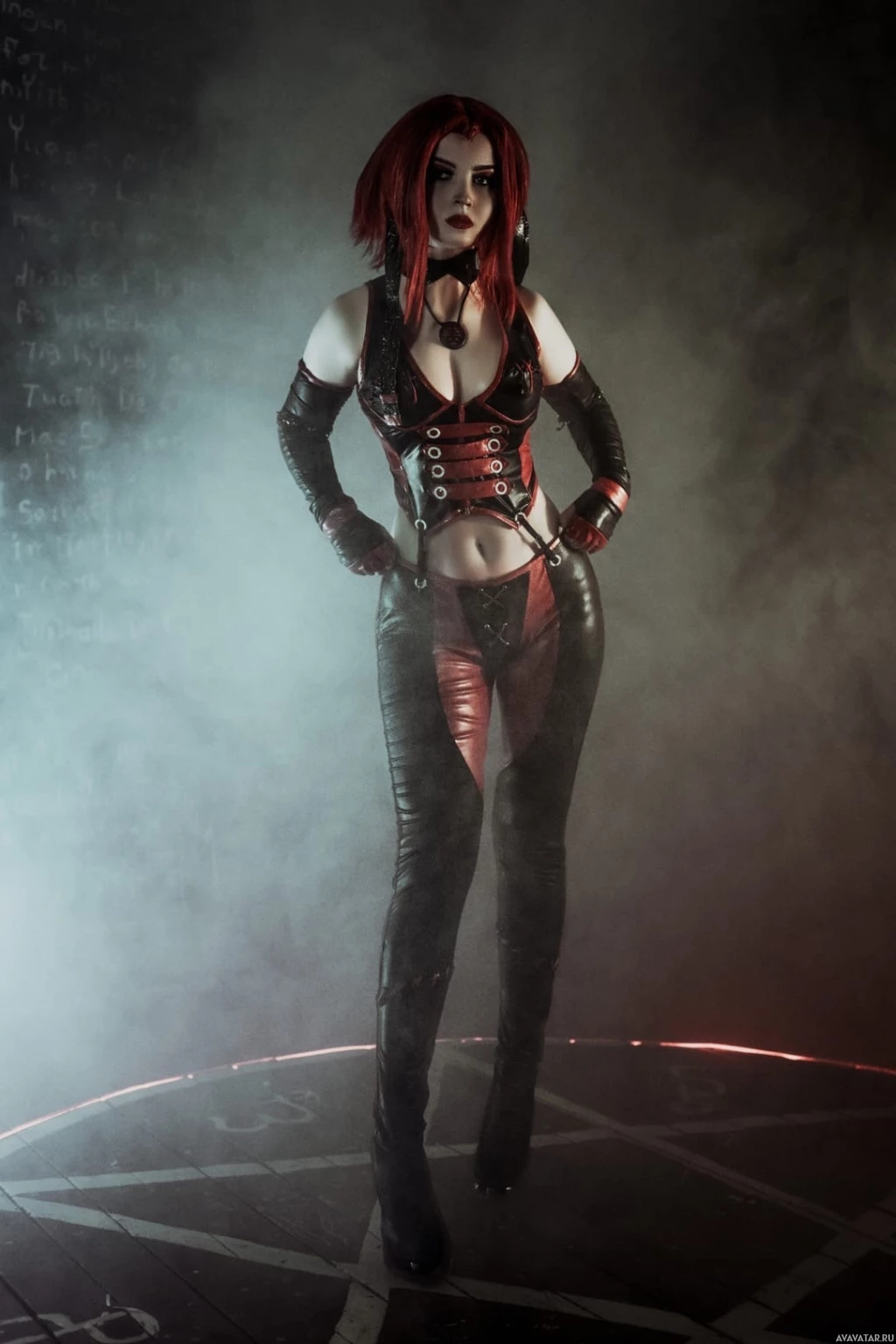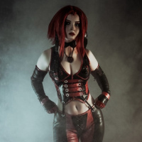 red accents, red boots, and what seems to be a leather or latex outfit with lace detailing. The overall atmosphere of the image suggests it may be related to cosplay, which is the practice of dressing up as a character from
