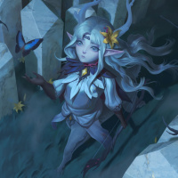 white hair and is wearing a bow on her head, which adds to the ethereal and magical appearance. The setting appears to be