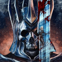 silver armor, which is commonly associated with the witcher class in the game. There is also a sword with what looks like blood on it, suggesting violence or battle. The background has an ominous tone, with