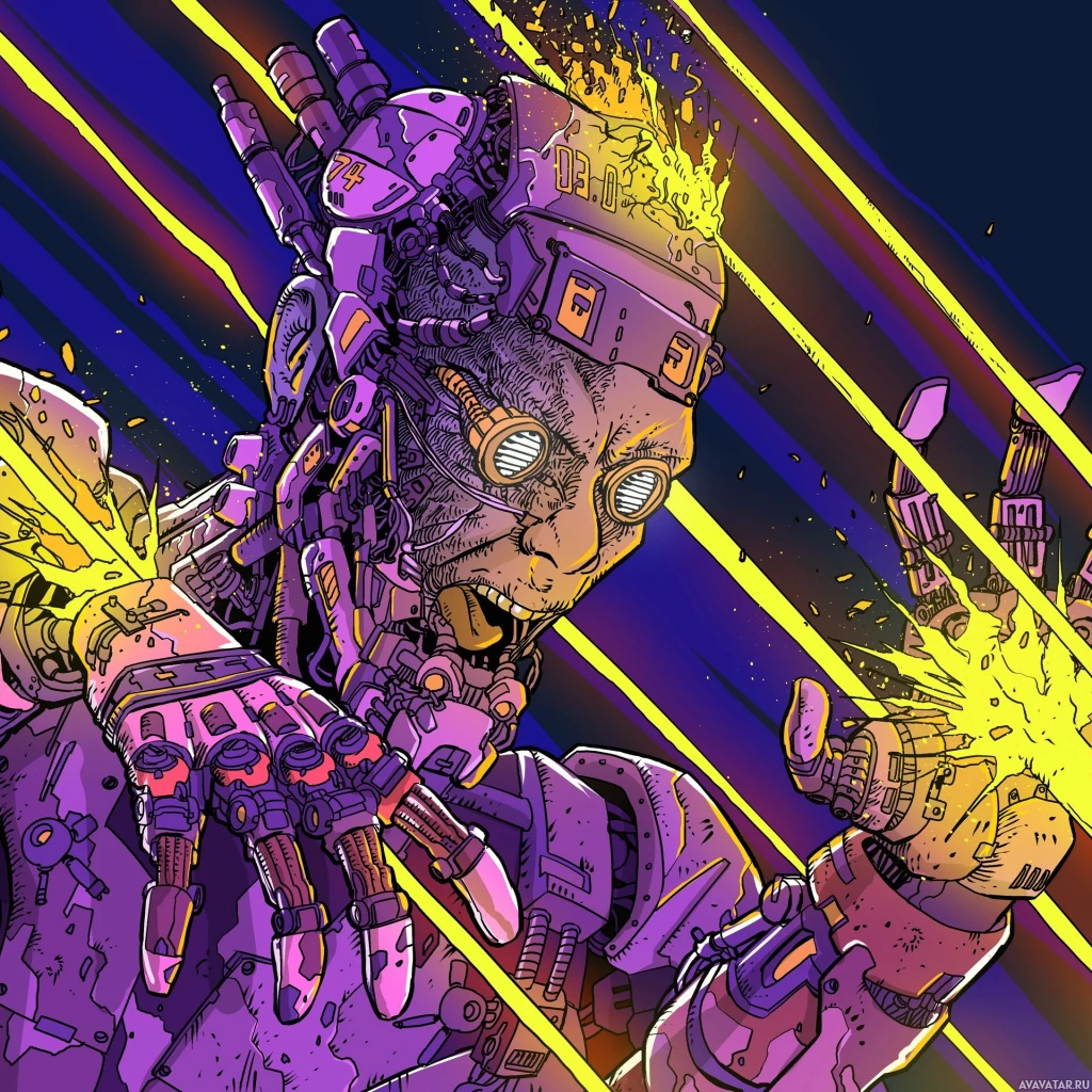 a science fiction setting. The robot has a humanoid form with a head, torso, arms, and hands, but its design is mechanical with visible cables and machinery that suggest