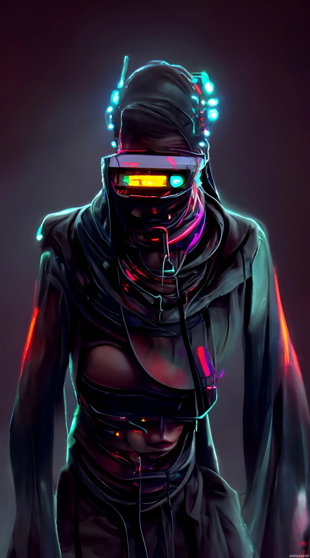 science fiction-inspired accessories such as headgear with glowing components, circuit-like patterns on the clothing, and possibly robotic limbs or enhancements. The overall aesthetic suggests a theme of