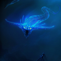 dark blues and blacks with accents of greenish-blues, creating a moody and mysterious atmosphere typical of fantasy artwork.