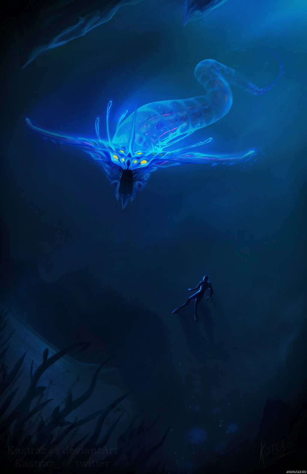 celestial body above, and there are faint outlines of structures that could be part of an underwater city or temple in the distance. The color palette is dominated by