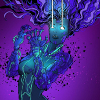 mechanical components visible in parts of her body. The background is dark with a cosmic feel, which complements