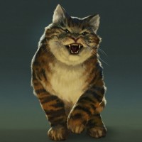 cat ears, and a tail, but it also walks on two legs like a human. The expression on its face is one of aggression or anger, as indicated by the wide-
