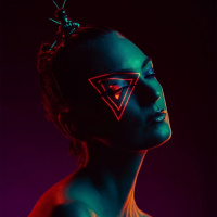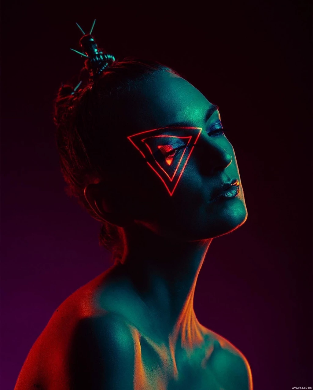 cyberpunk vibe. Her hairstyle is also unusual, with the hair pulled back into a tight bun, adorned with what looks like digital triangles, enhancing the edgy, tech-inspired theme of her appearance. The lighting in the photograph highlights the shades of purple and green that are commonly associated with neon colors, contributing to an overall
