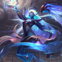 white hair. The character is depicted wielding some kind of staff or wand that emits blue and purple