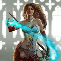 На картинке изображен женский персонаж из видеоигры "Kingdom Come: Deliverance". Она одета в средневековые доспехи, на поясе у нее прикреплены ножны для меча, а волосы у нее светлые. Персонаж использует магическое синее заклинание или энергию. Ее наряд наводит на мысль, что она может быть вовлечена в игру с элементами фэнтези, которая часто включает в себя магию и фантастические способности.