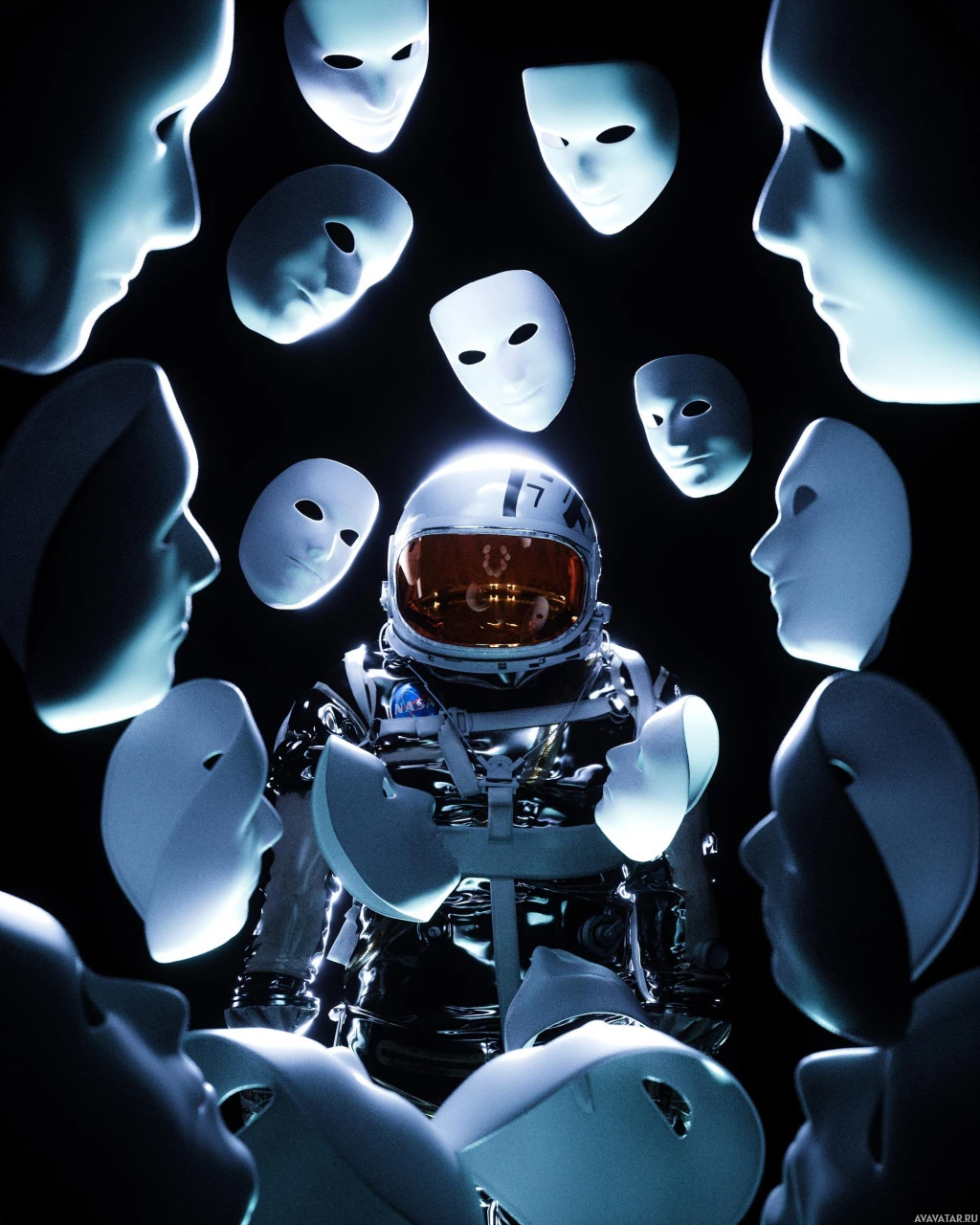 a space suit surrounded by numerous white masks, which appear to be floating or dispersed around them. This gives the impression that the astronaut is being enveloped or confronted by these masked figures, possibly symbolizing some sort of psychological or emotional encounter. The