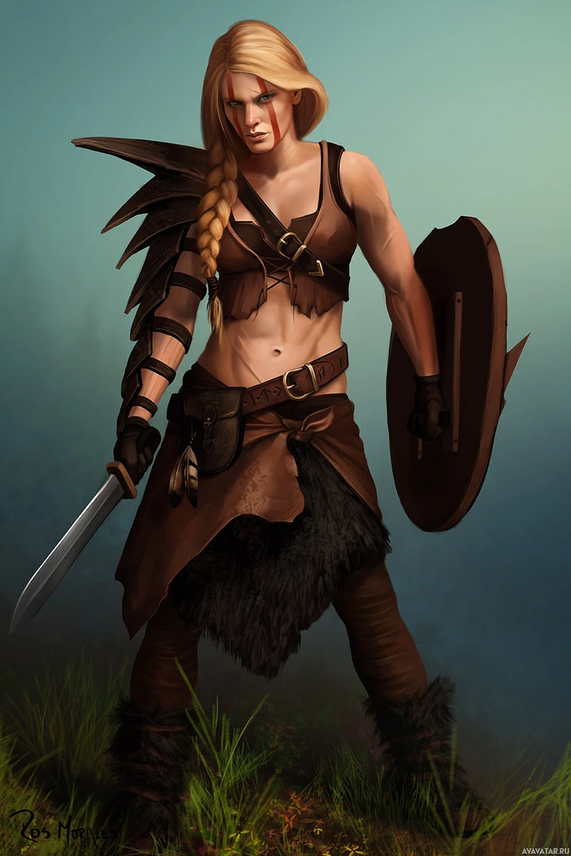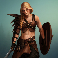 a female character dressed in fantasy-style armor and clothing, reminiscent of a warrior or fighter from a mythical or historical setting. She is holding a sword with one hand and what appears to be a shield with the other. Her attire includes