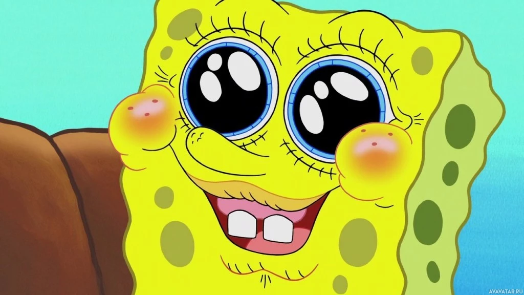 emotional response or emphasis on whatever he is perceiving. The background is minimalistic, featuring a brown wall and the ocean floor, providing context for SpongeBob's