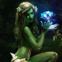 vibrant colors, such as blue for the flower and yellow for some of the floral elements, which stand out against the green tones of her skin and the dark background. The overall composition evokes a sense of tranquility and mystique, fitting within the context of