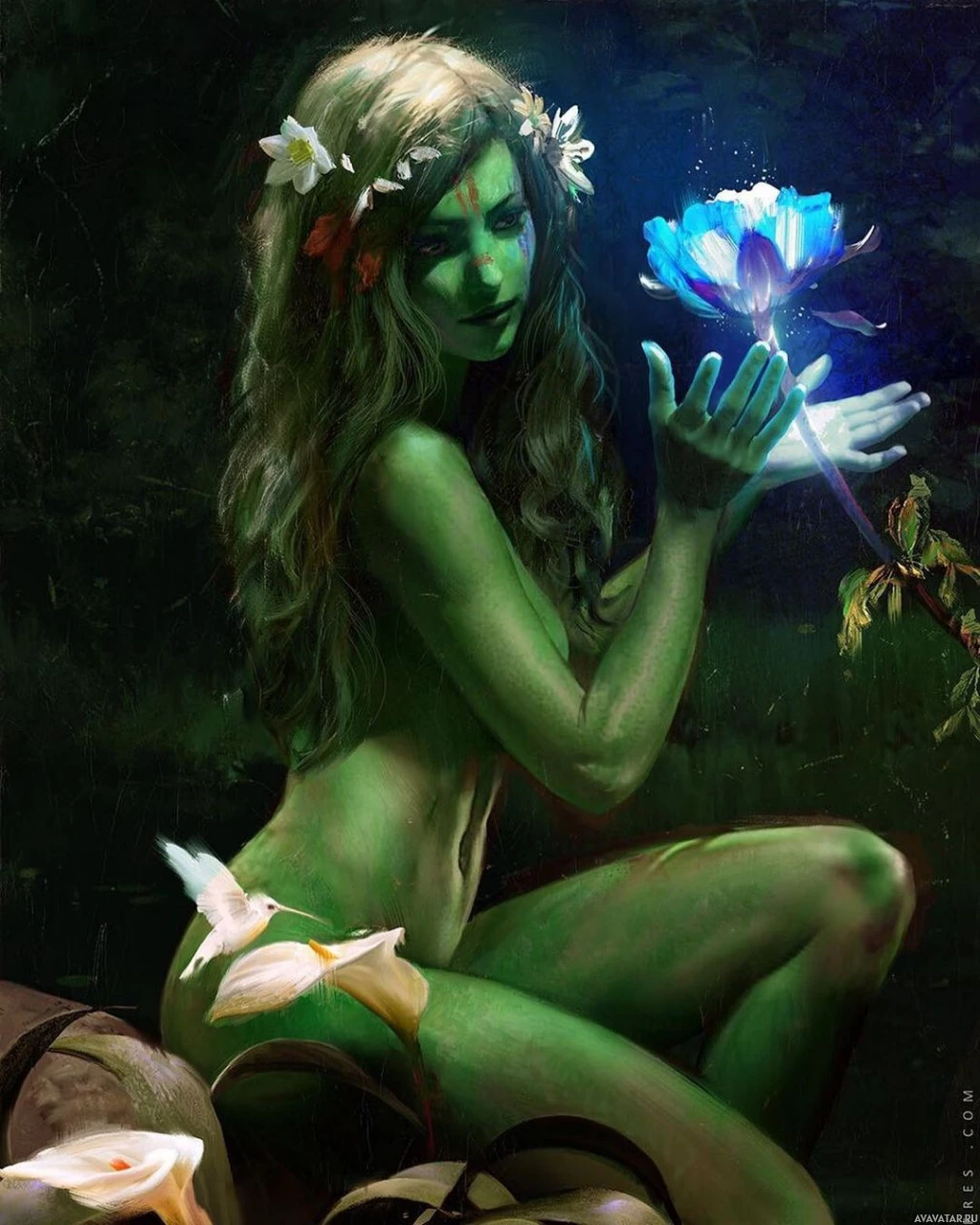 a female figure. She appears to be a dryad, often associated with nature and forests in folklore and mythology. Her body is painted in a mossy or olive green hue that suggests her connection to